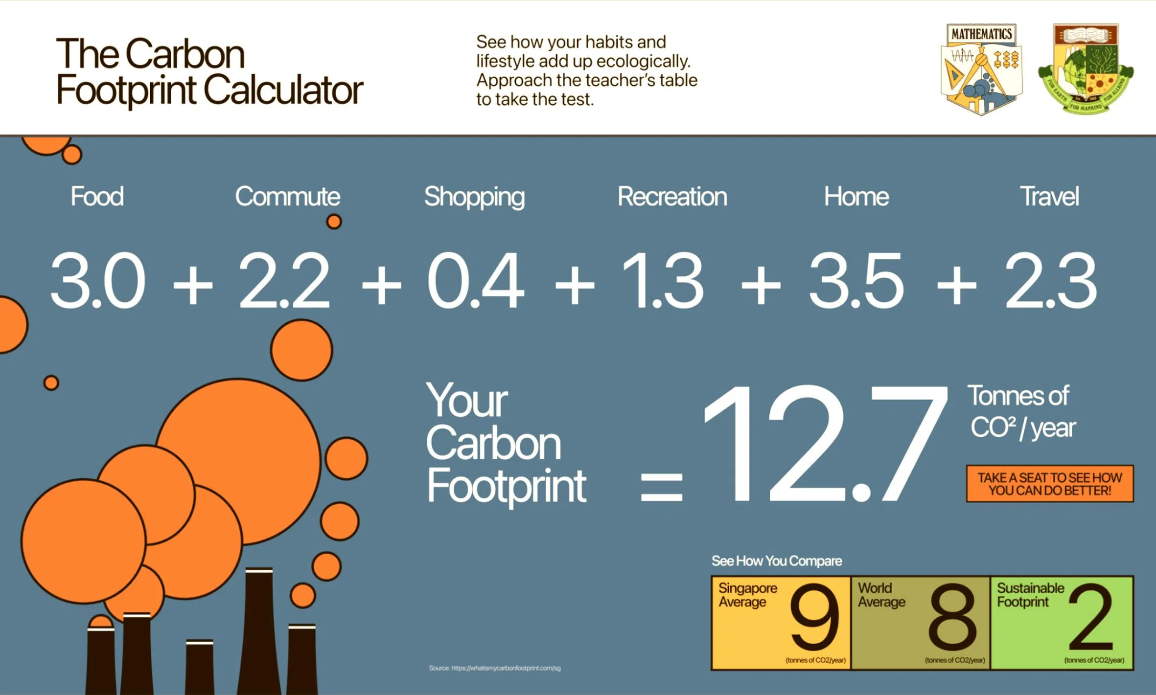 In the mathematics “class”, there is an interactive carbon footprint calculator where visitors can do the maths on their personal carbon footprint to find out how sustainable their current way of life is.