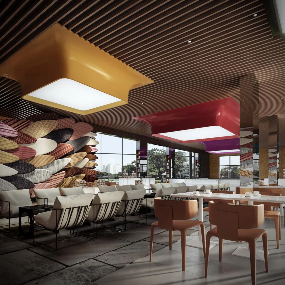 The original single-storey houses were redeveloped into two-storey structures. The hub’s ultra-modern facade features glass panels and rammed earth, with interiors that have a modern palette and materials such as acrylic and steel.