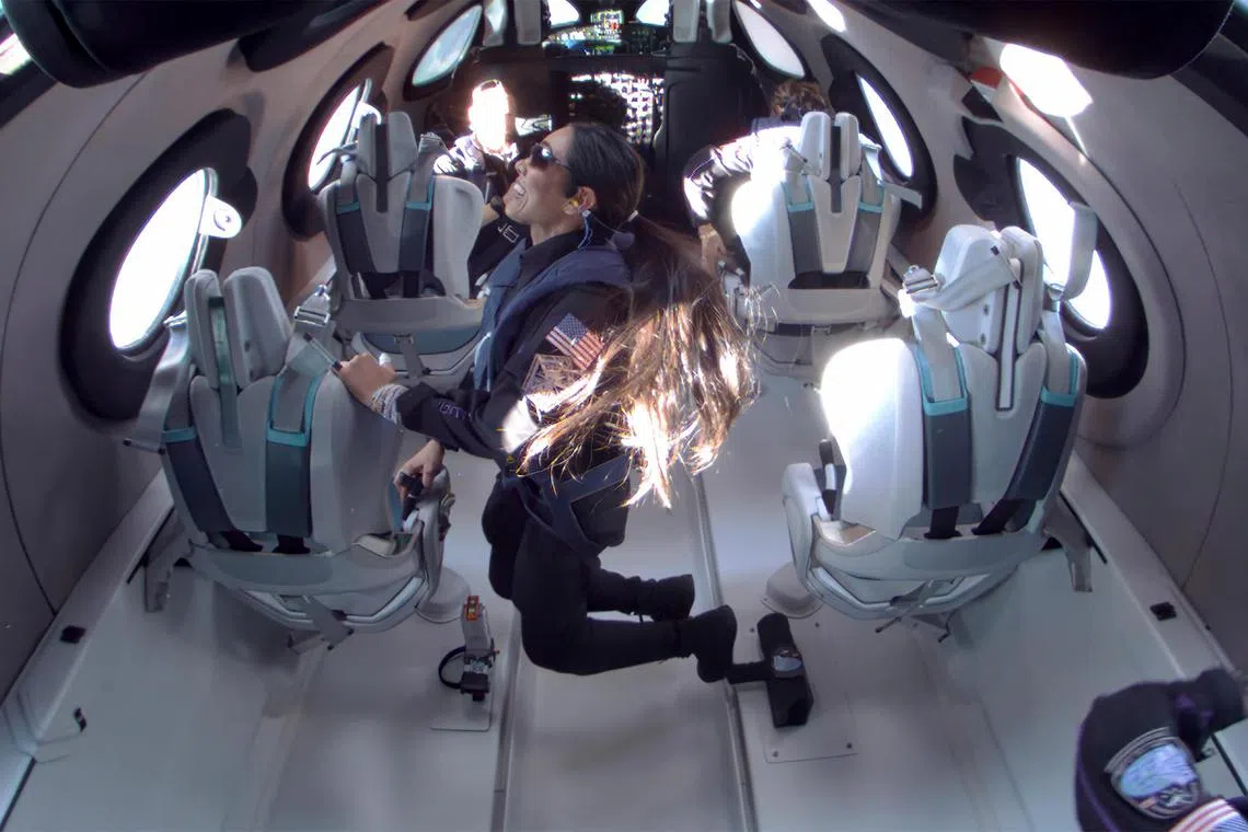 Crew member and scientist Kellie Gerardi enjoying a few minutes of weightlessness on a Virgin Galactic flight.
