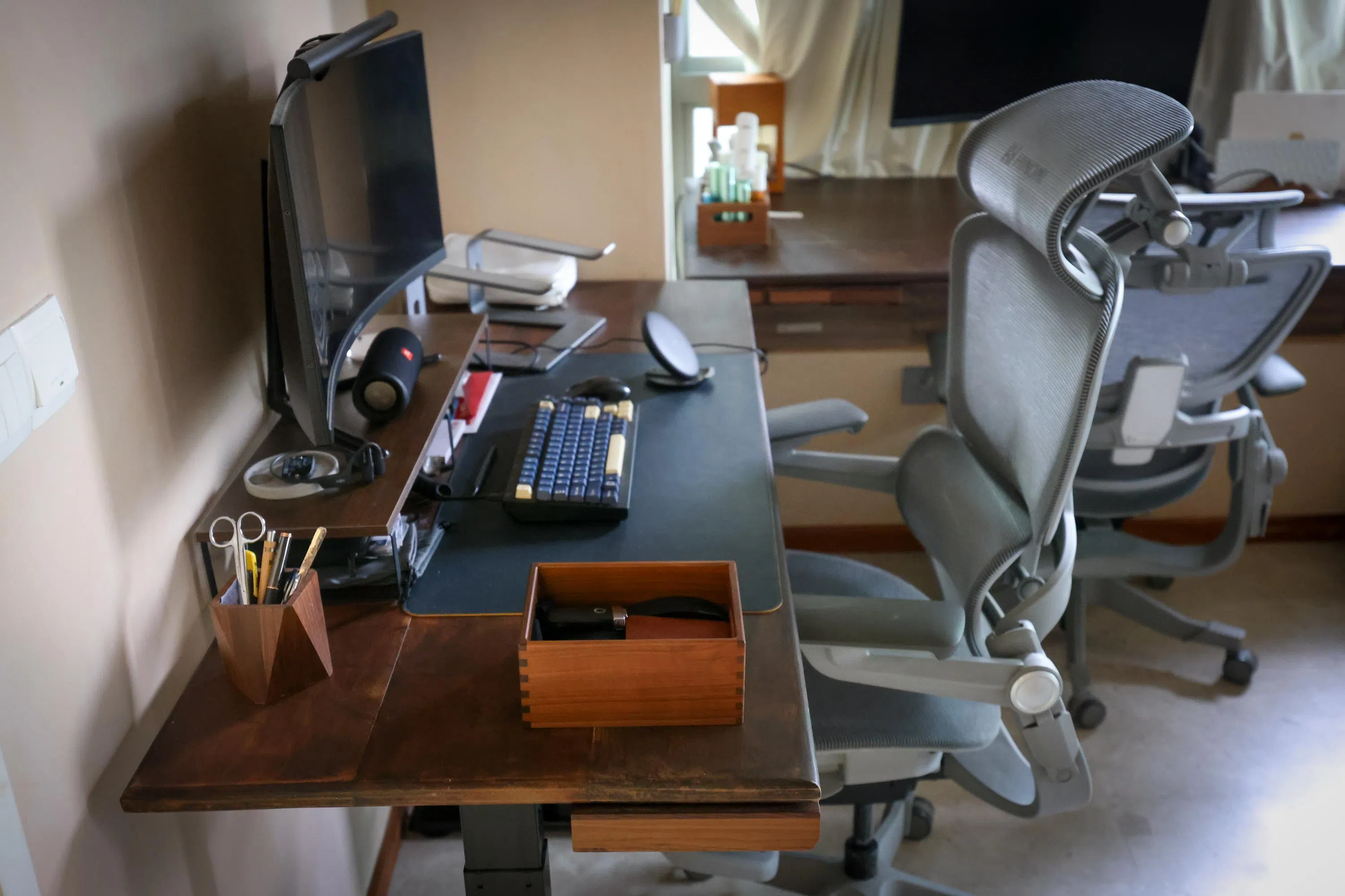 “The actual woodworking doesn’t require skills,” Ms Chew says, referring to the tabletops. They bought the legs for their dining table, which doubles as a bar countertop, as well as the standing desk mechanisms.