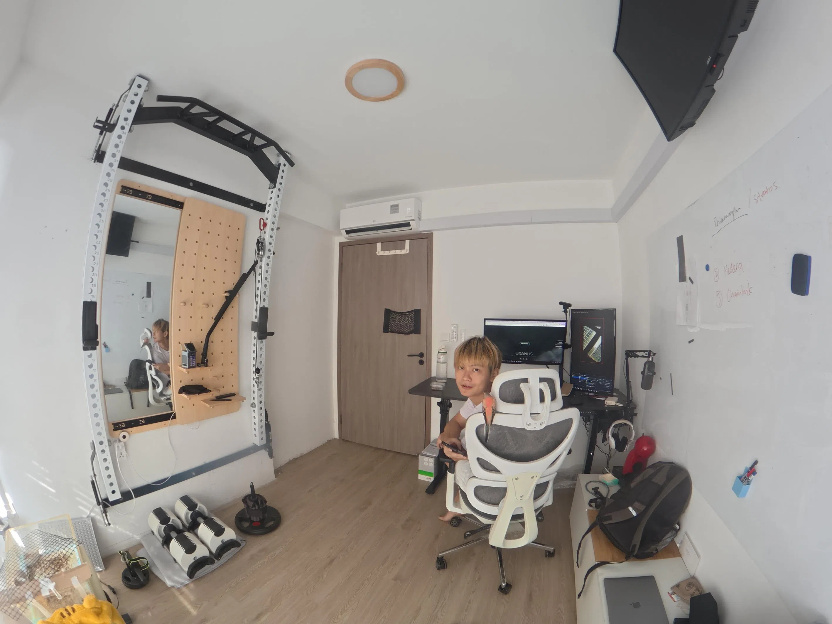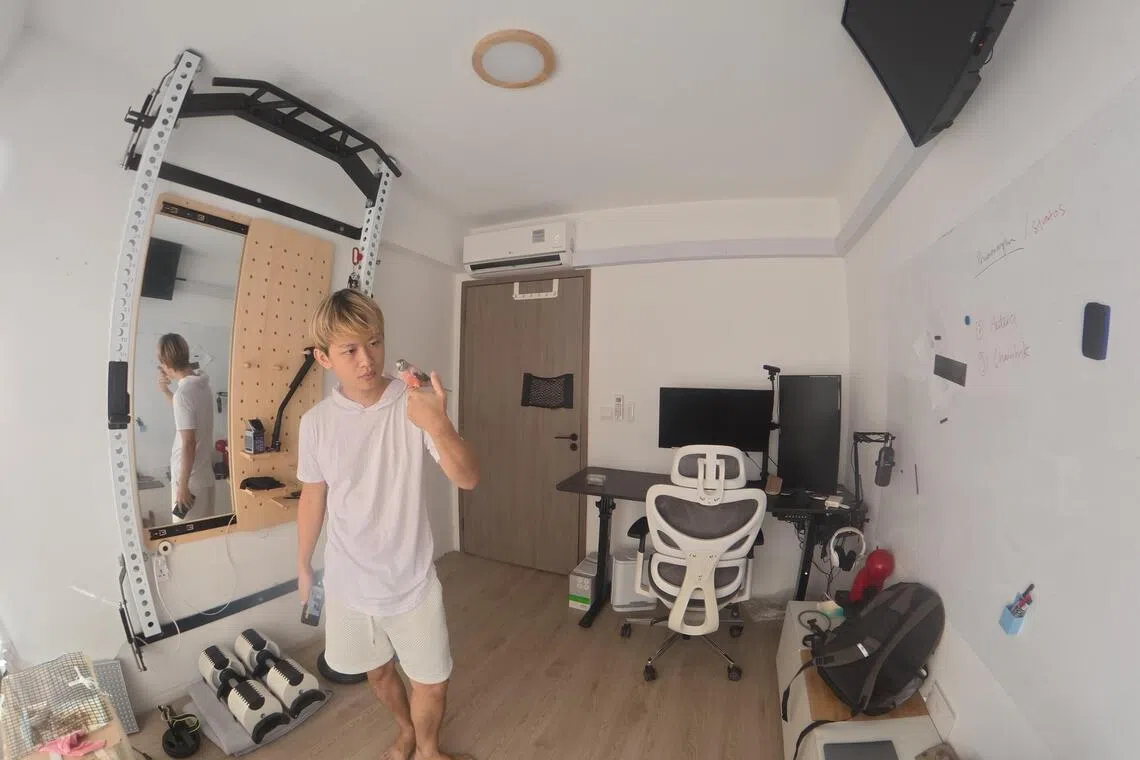 Mr Sim Kwang Wei in the home gym and study room he built himself.