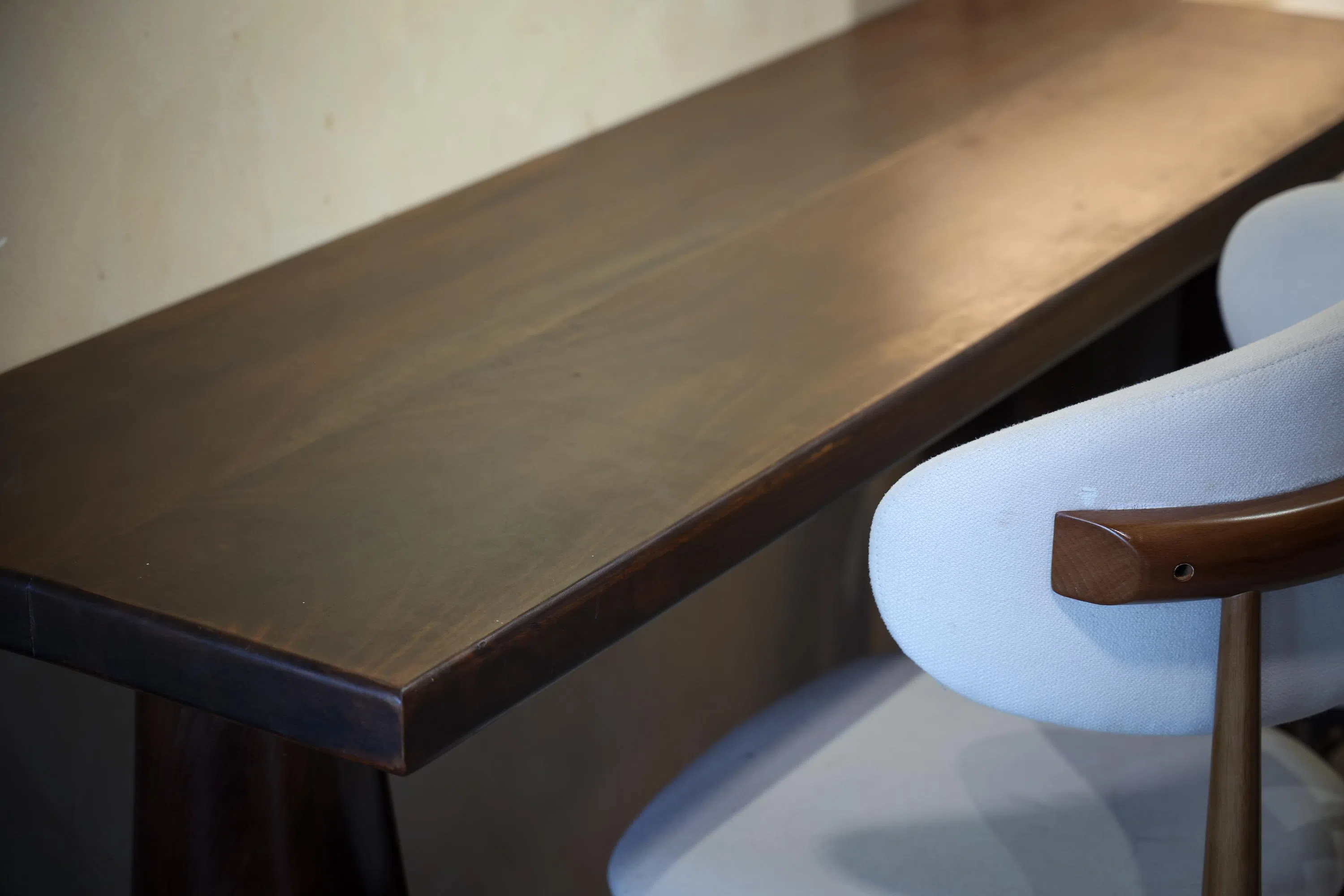 The dining tabletop, which doubles as a bar counter, woodworked by the couple.