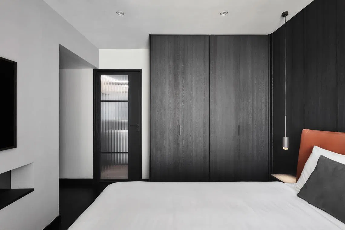 The dark theme continues into the master bedroom, which has been decked out to achieve the ambience of a hotel room. A dark wood laminate headboard wraps around the bed and continues into the wardrobe doors.