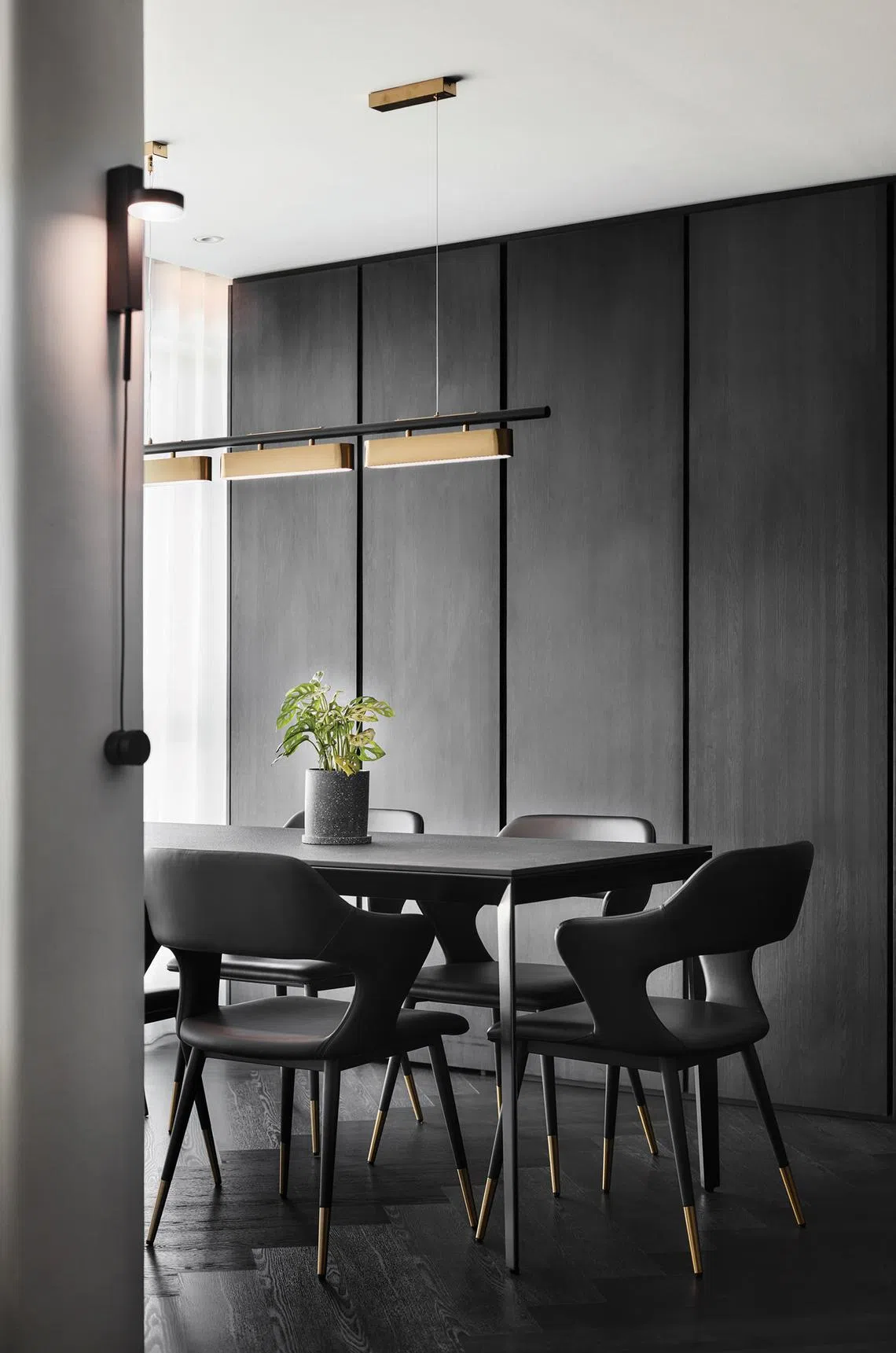 Gold accents from the Jupiter Lightz pendant lamp and GreyHammer dining chairs add a touch of luxe juxtaposed against the dark dining room backdrop.