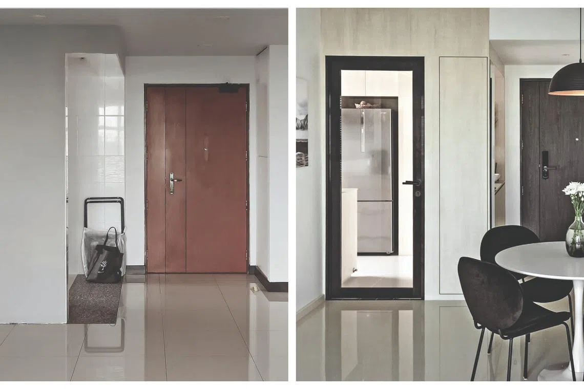 Mr Teo and the designer introduced a half-height shoe cabinet and installed an internal window to let natural light into the foyer. By shifting the kitchen entrance to face the living area, they were able to add a slim bar cabinet as well.