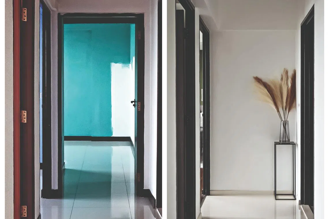 The unit has a long hallway leading to the bedrooms, which initially led directly to the master bedroom. As Mr Teo wanted to reconfigure that room and convert another room into a study, the door to the master bedroom was moved to the side.
