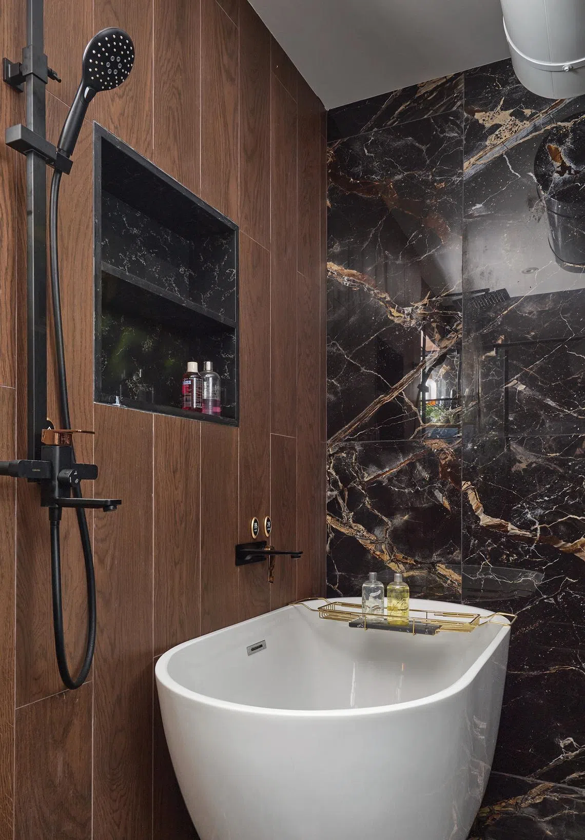 Its dark wood palette, dark grey marble bathroom wall with dramatic gold veins, a freestanding bathtub and integrated track lighting in the walk-in wardrobe exude the ambience of a luxury hotel suite.