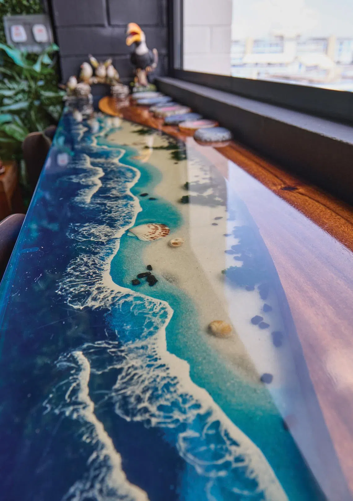 A nature lover, Mr Ng enjoys relaxing in the double-volume balcony, which has an artificial vertical green wall that extends up to the second storey, a timber-look ceiling and flooring, and a resin counter table featuring a beach and seascape.