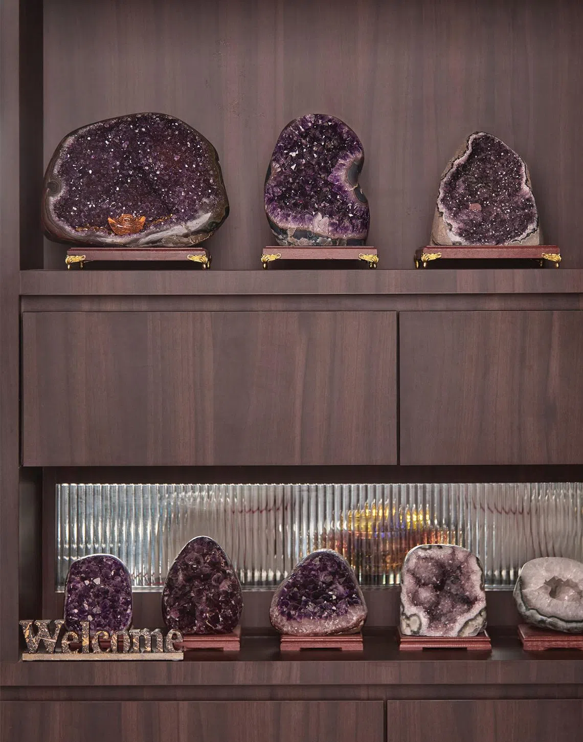 Amethyst crystals of all shapes and sizes are displayed on an L-shaped shelf facing the main entrance. Apart from showcasing his collection, the shelf also screens the rest of the unit from view.
