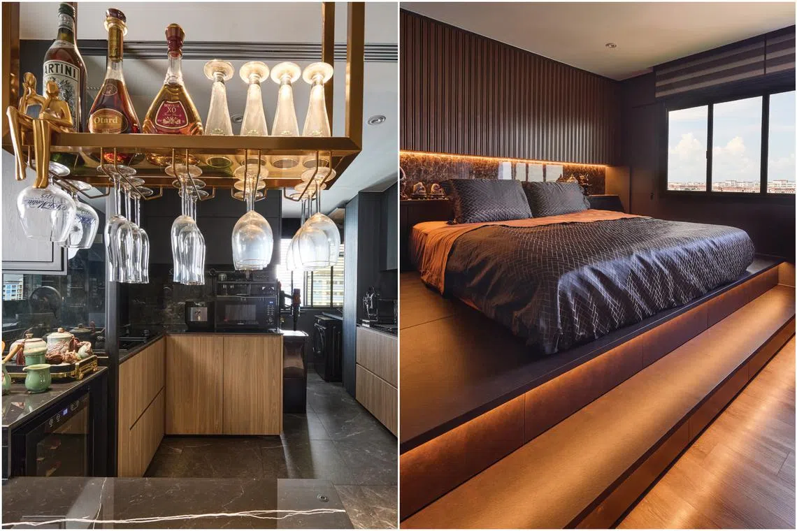 The kitchen island also functions as a bar counter (left) while Mr Ng’s bedroom has an elevated platform bed.