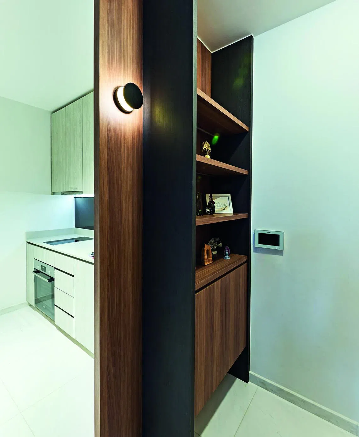 The display shelves outside the kitchen are the owner's favourite element of the home. He loves the way the shelf lights interact with the adjacent wall.