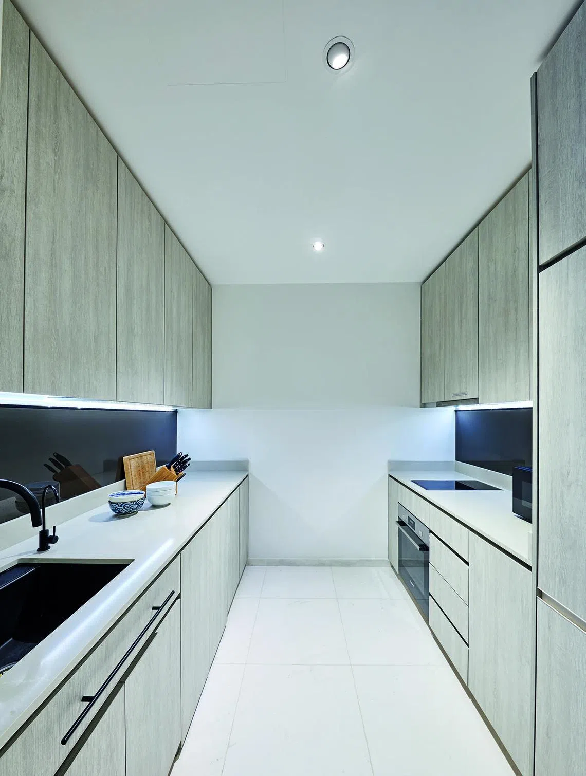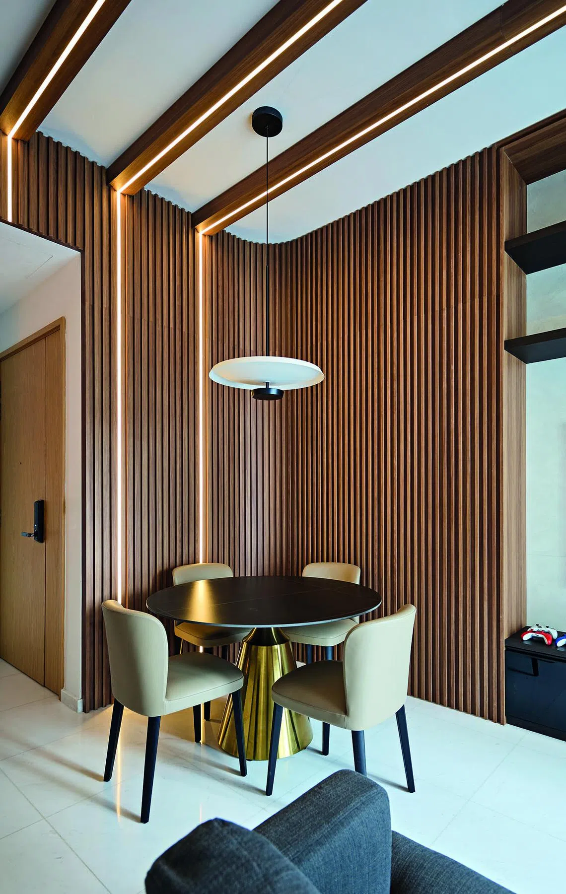 Mr Lim had only a few requests: lighting and fluted wall panels to accentuate the 3.25m-high ceiling, a kitchen that can be enclosed using a sliding door that retracts behind a display shelf, and built-in shelves on one side of the bed.