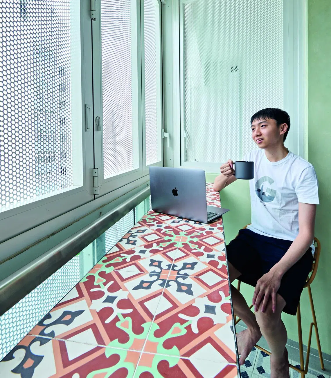 The small, oddly shaped balcony presented a challenge, but Mr Li livened up the space by using textured green paint on the walls to evoke nature.