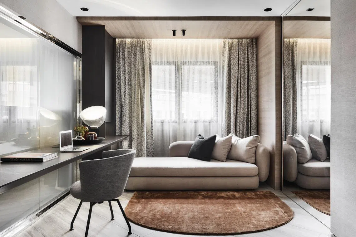 Ms Yeo works at a long, built-in desk on one side and relaxes in a daybed by the window, with plenty of room in the middle for her to do yoga.