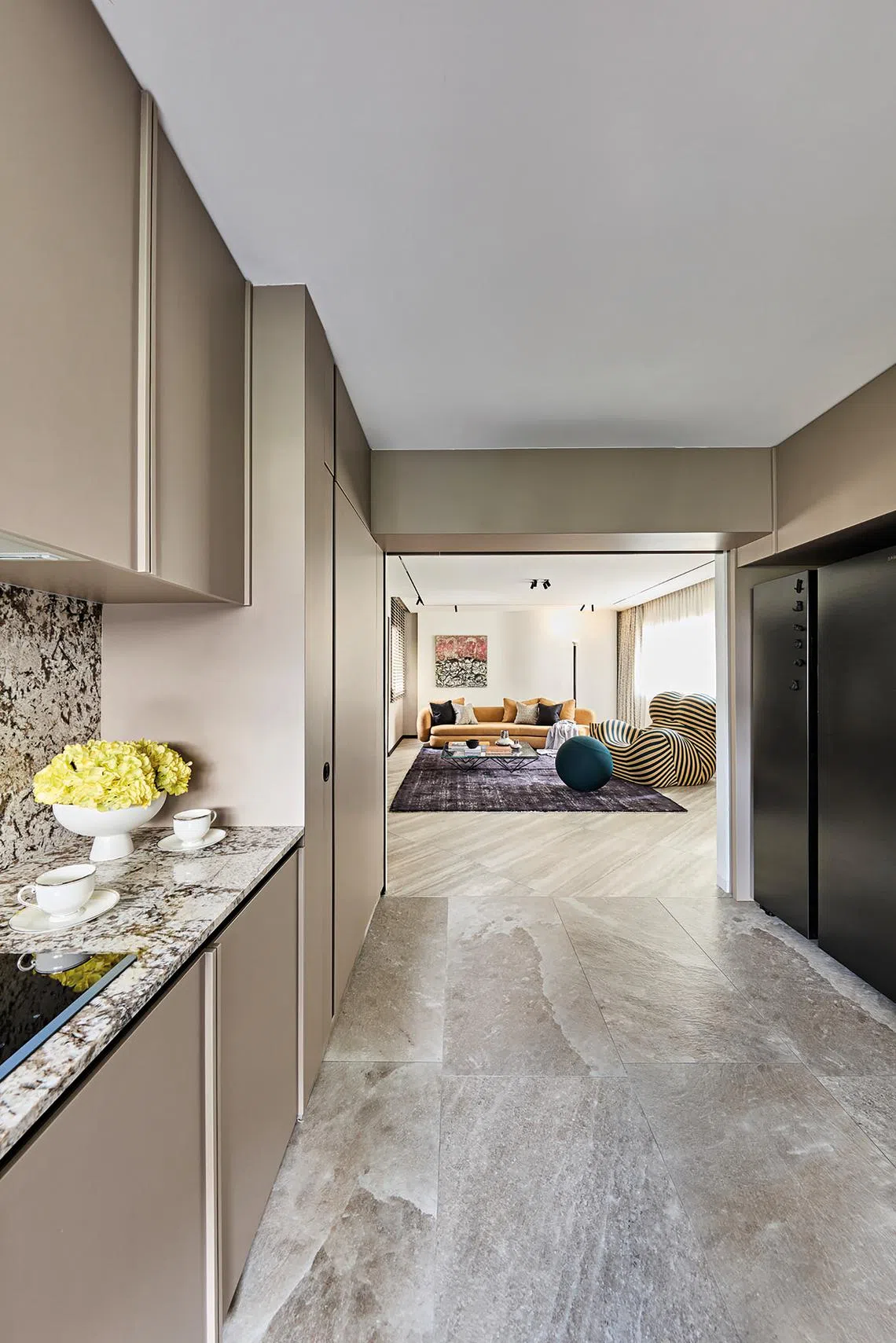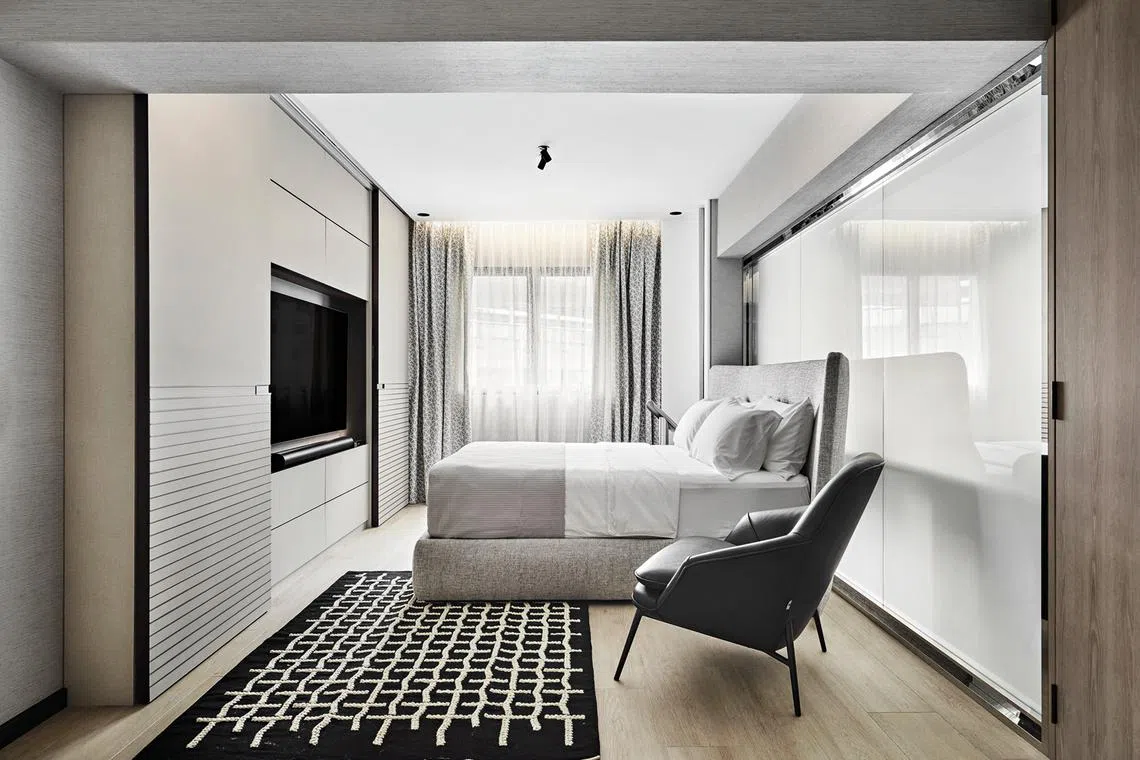 The apartment’s irregular floor plan presented a challenge. Mr Yeo opened up the study area and adjacent bedroom to create a long corridor that spans the length of the flat – an expanse that stretches from the main entrance to the wall at the end.
