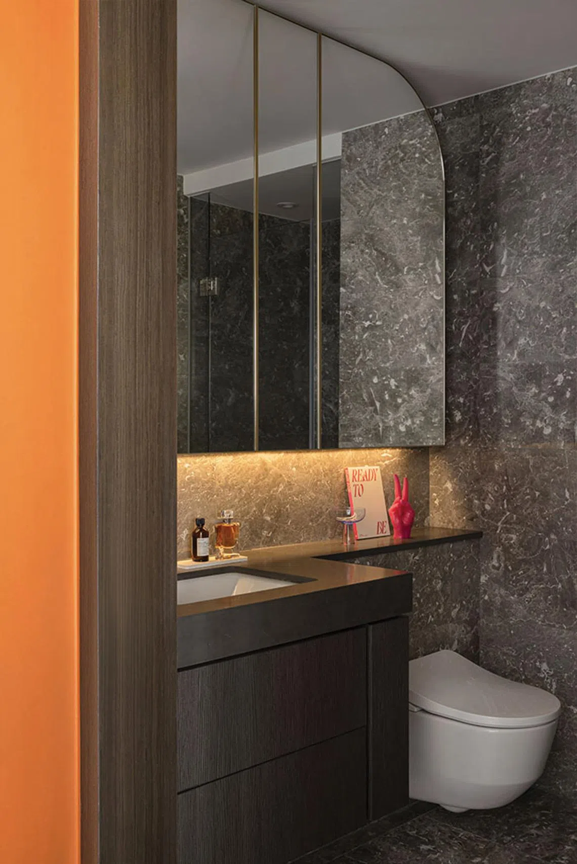 One of the challenges that the design team encountered was how to deal with the existing dark grey marble flooring.