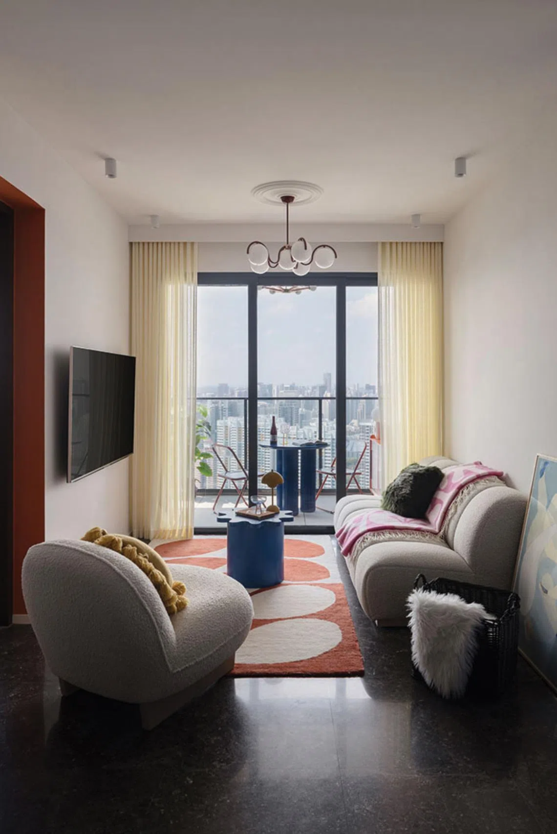 An off-white sofa and armchair from Castlery is juxtaposed against a palette of electric blues, pinks, yellows and oranges from the coffee table, rug, lamp and cushion.