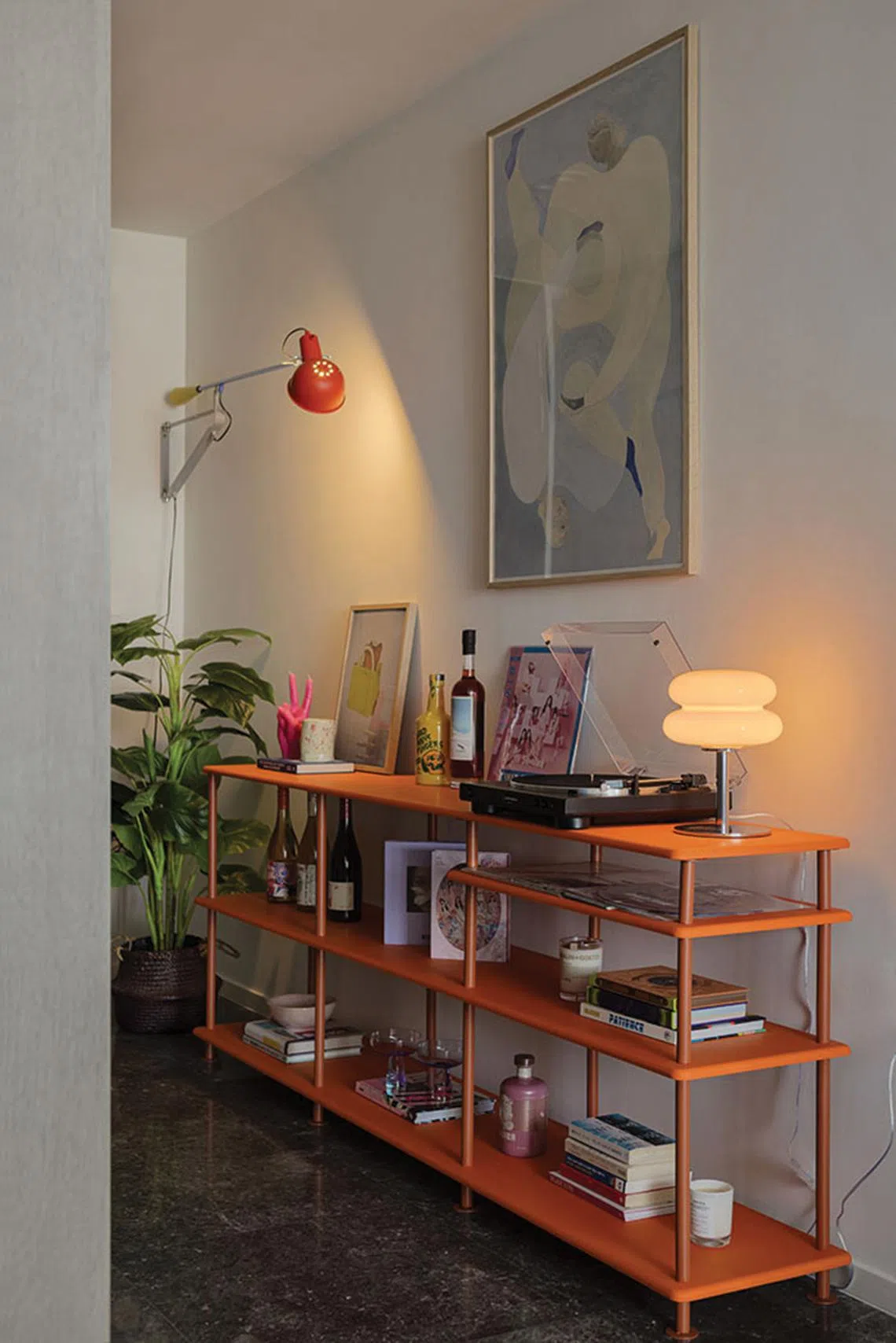 Instead of built-in storage cabinets, the entrance foyer features low, slim open shelves in an eye-catching orange that provide storage and display space without encroaching on the floor area.