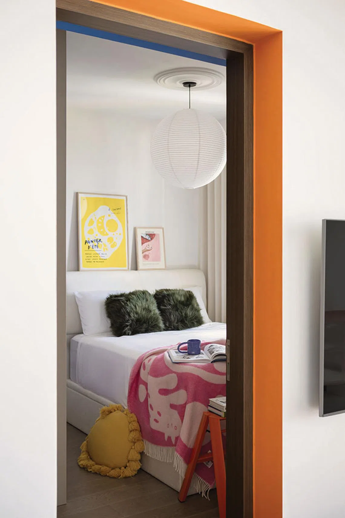 However, the room is brightened up by accessories in striking colours such as orange, yellow, pink and green. The existing wood flooring injects warmth that gives the space a cosy and inviting ambience.