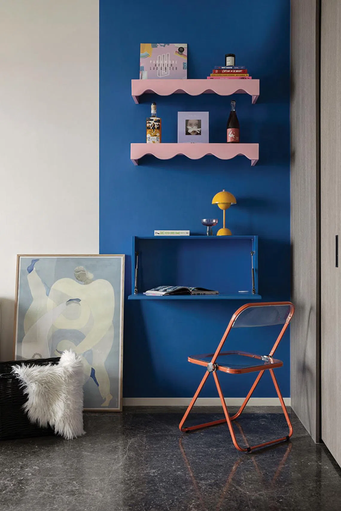 A flip-down desk from Rooma is mounted against a blue backdrop, with pink shelves for a whimsical touch.