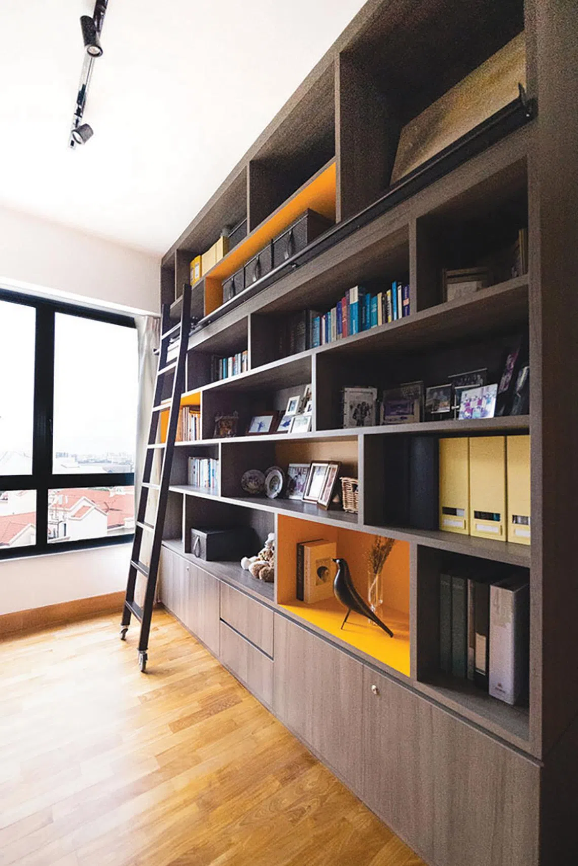 A custom-built bookshelf provides stylish storage.