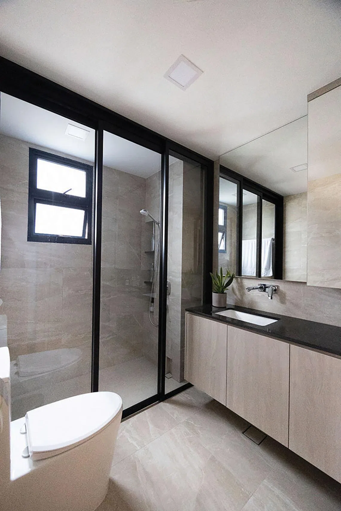 The bathroom continues the home’s modern theme. A black-framed sliding glass door demarcates the shower area, adding contrast to the light tiles. Stone-textured tiles on the floor and walls foster a sense of groundedness and create a contemporary look.