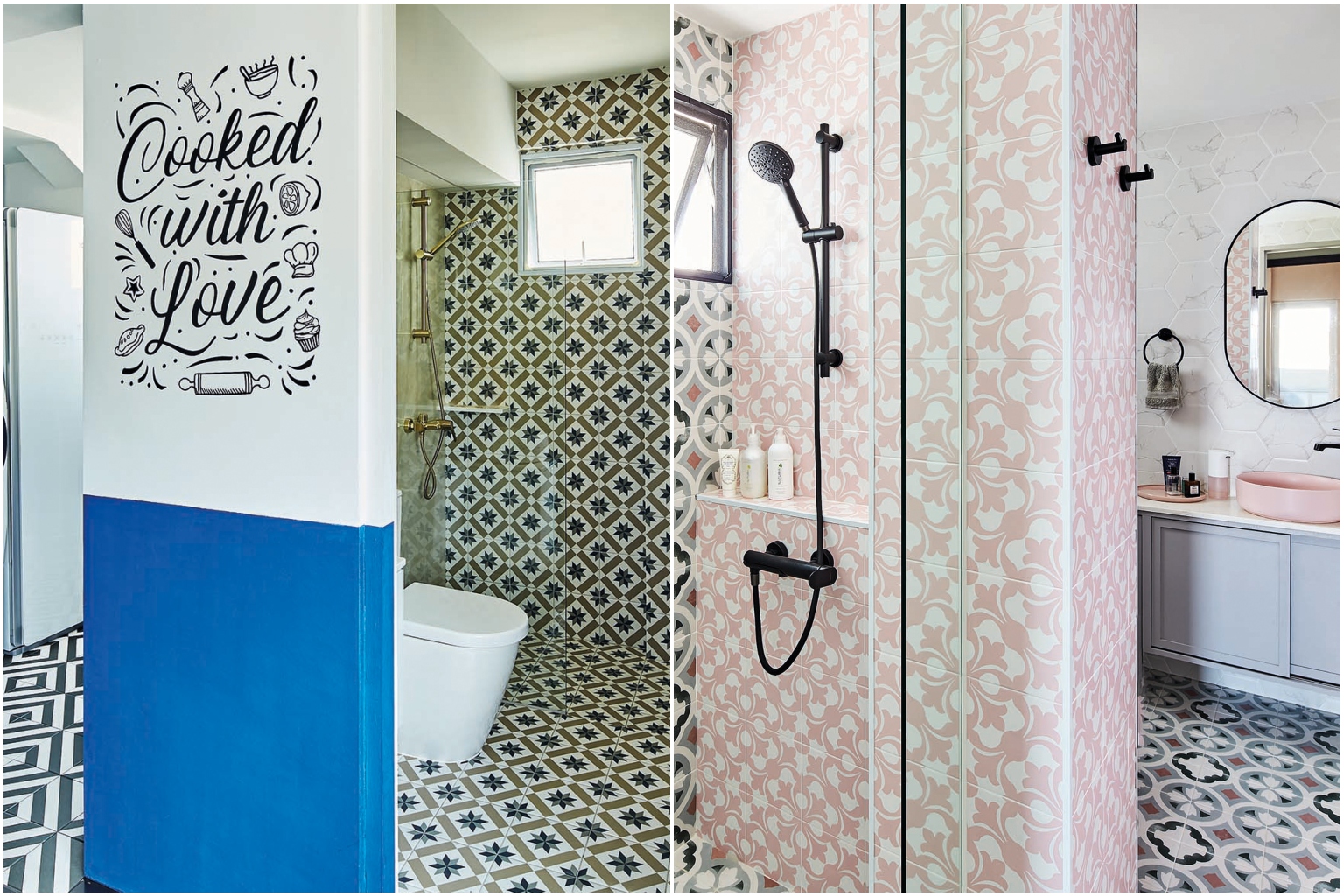 The original bathrooms were so cramped that Ms Kuay had them combined. "With a larger shower enclosure and double vanity sinks, the new bathroom is more spacious, providing more than enough room for the couple to get ready in the morning," she says. It is also visually striking with its mix of grey and pink patterned tiles from Hafary and Soon Bee Huat.