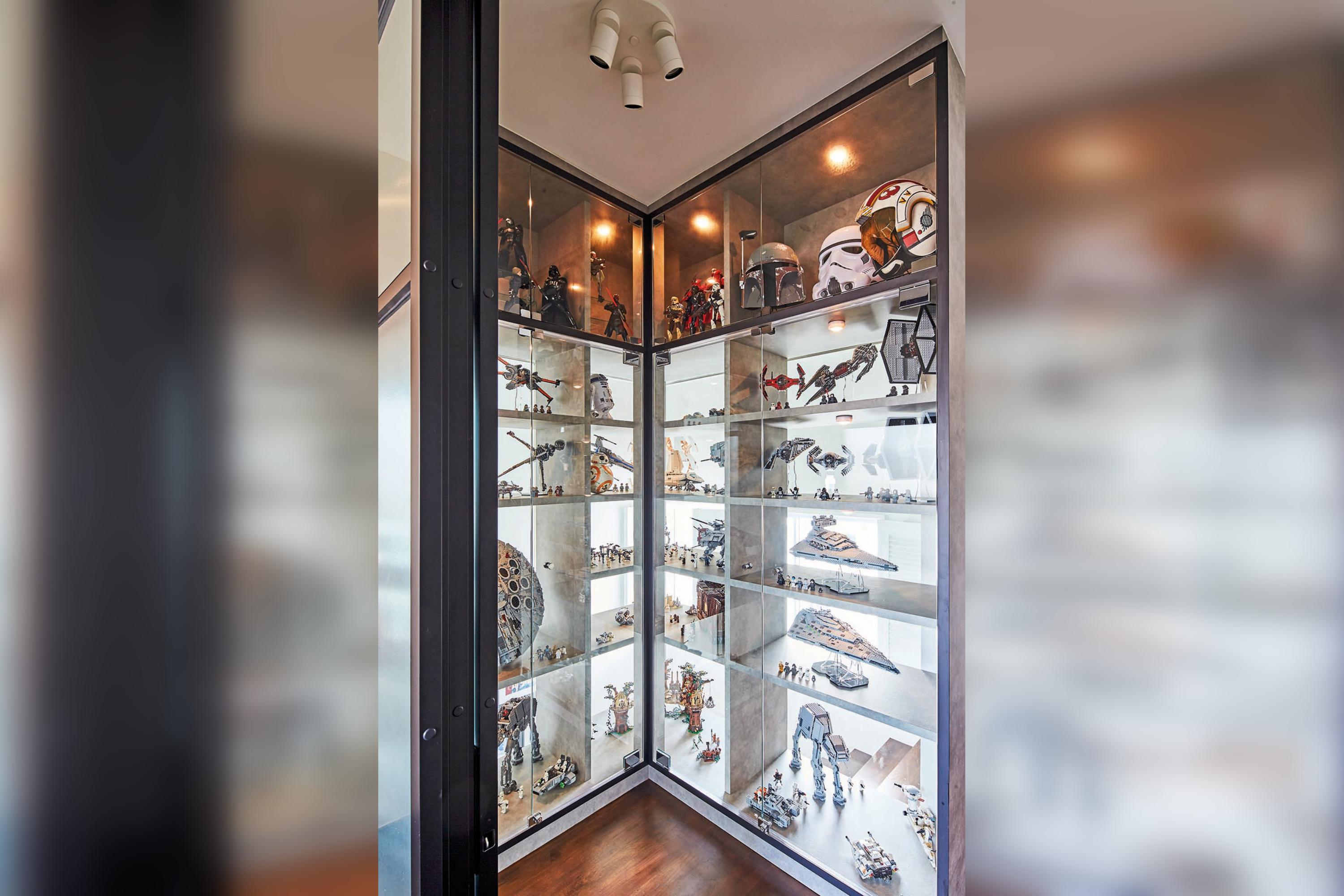 The next room's sole purpose was to display the couple's Star Wars memorabilia, with glass shelves showcasing the figurines from the popular franchise under spotlights. Says Thomas: "Our home tells the story of who we are and our interests."