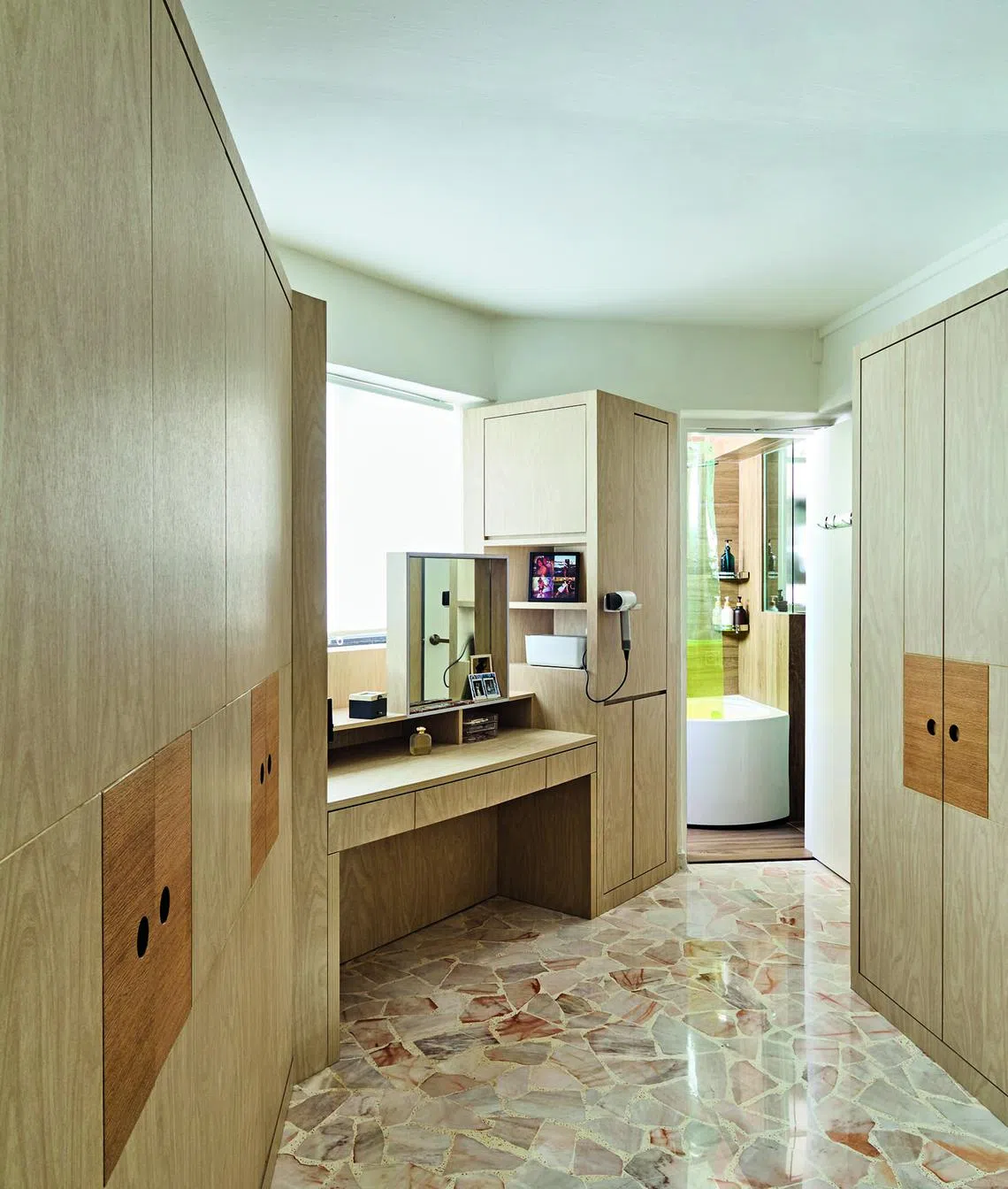 They had specific requirements in their design brief. Apart from retaining the existing flooring, they wanted an open plan that would maximise natural lighting and cross-ventilation, allow them to host gatherings and fit everything they needed for their hobbies – Mr Lee is into pottery, while Ms Tang is an avid reader. The couple also have a significant amount of shoes and clothes.