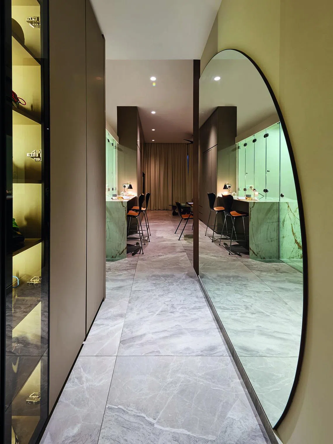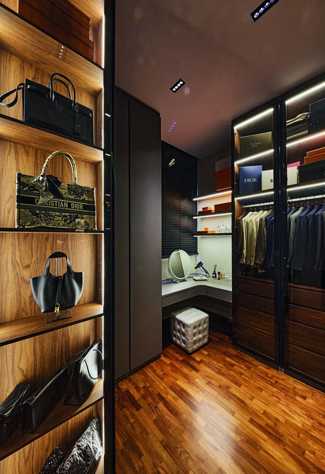 The walk-in wardrobe was designed to highlight Serene’s bag collection, Louis’ bespoke suits and the couple’s luggage. Each collection is housed in gently lit glazed compartments that resemble those of high-end boutiques.