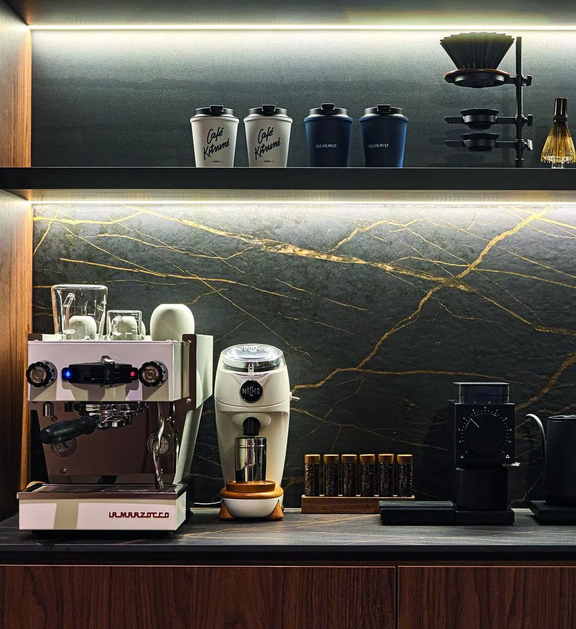 The coffee bar countertop and backsplash, as well as the breakfast and kitchen counters, feature Dekton (a mix of glass, porcelain and quartz) surfaces in black and white, though both colourways have similar copper veining.