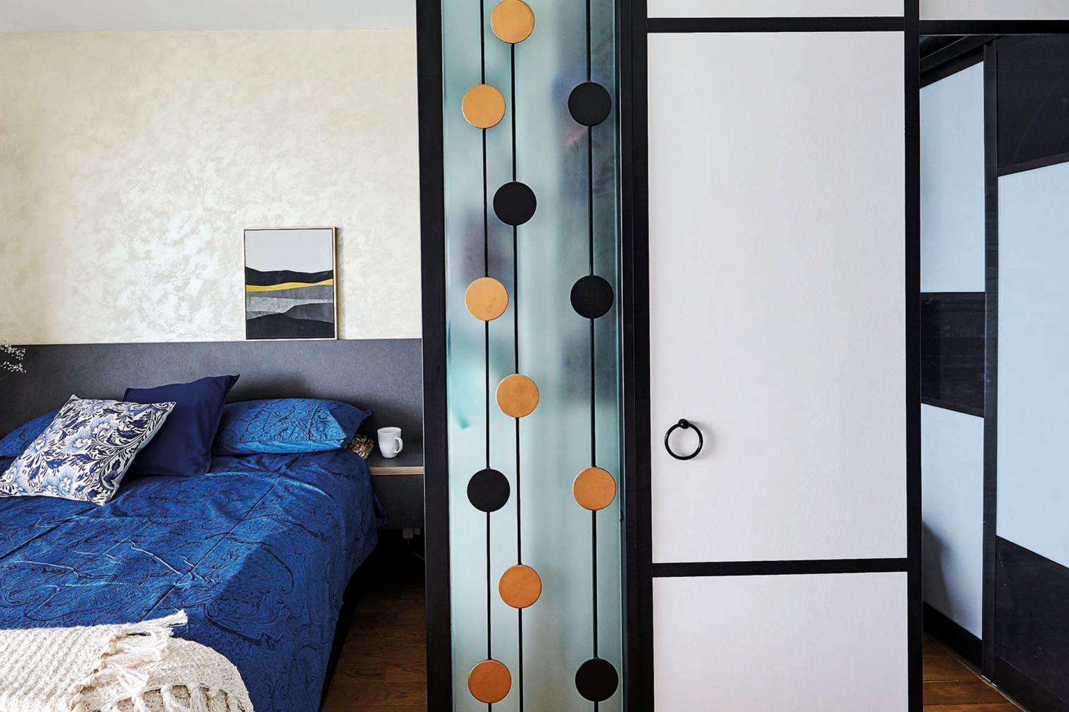 Incorporating sliding elements, such as the barn door leading to the bedroom, also takes up less space. When shut, it resembles a feature wall.
