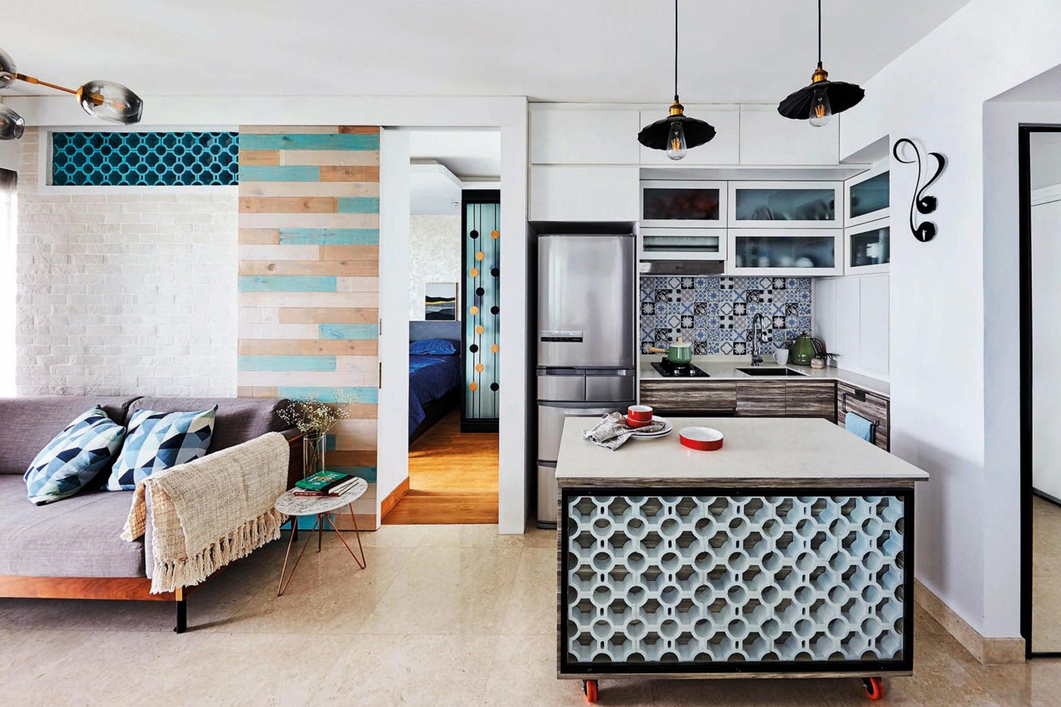 Geometric ventilation blocks in the living room wall and on the movable kitchen island, as well as the Peranakan tiles that make up the backsplash in the kitchen, give the space a distinct character. Keeping them in shades of calming blue adds a contemporary update while unifying the overall look.