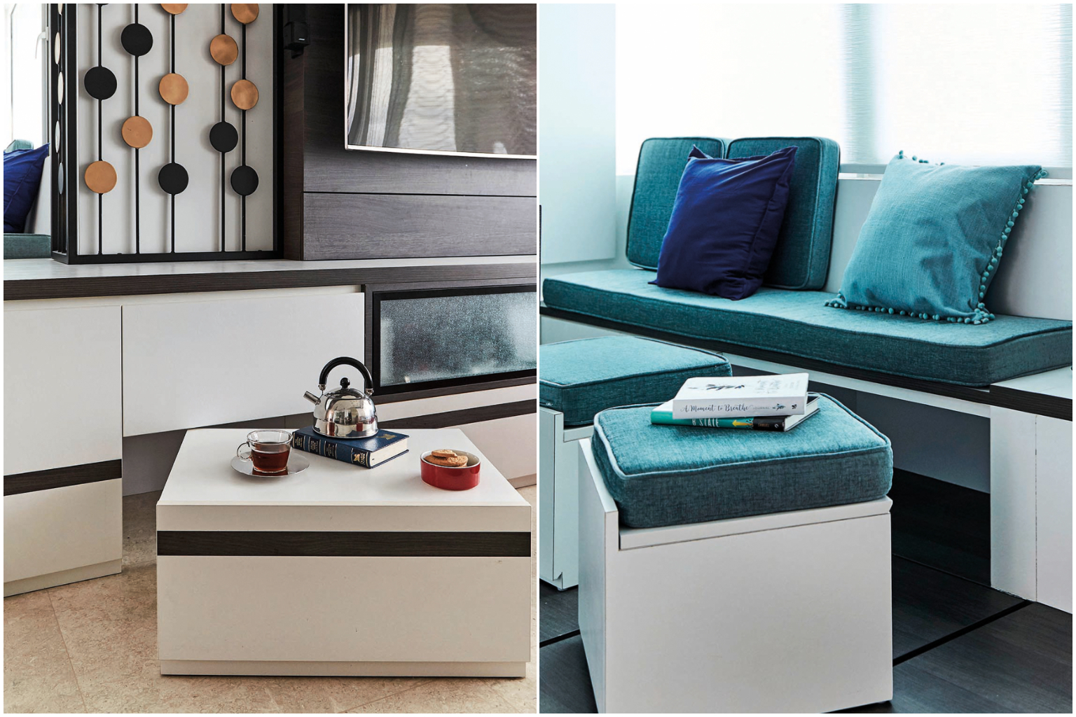 The units beneath the banquette in the adjacent room can also be pulled out and used as extra seating when Ms Tan's friends visit.