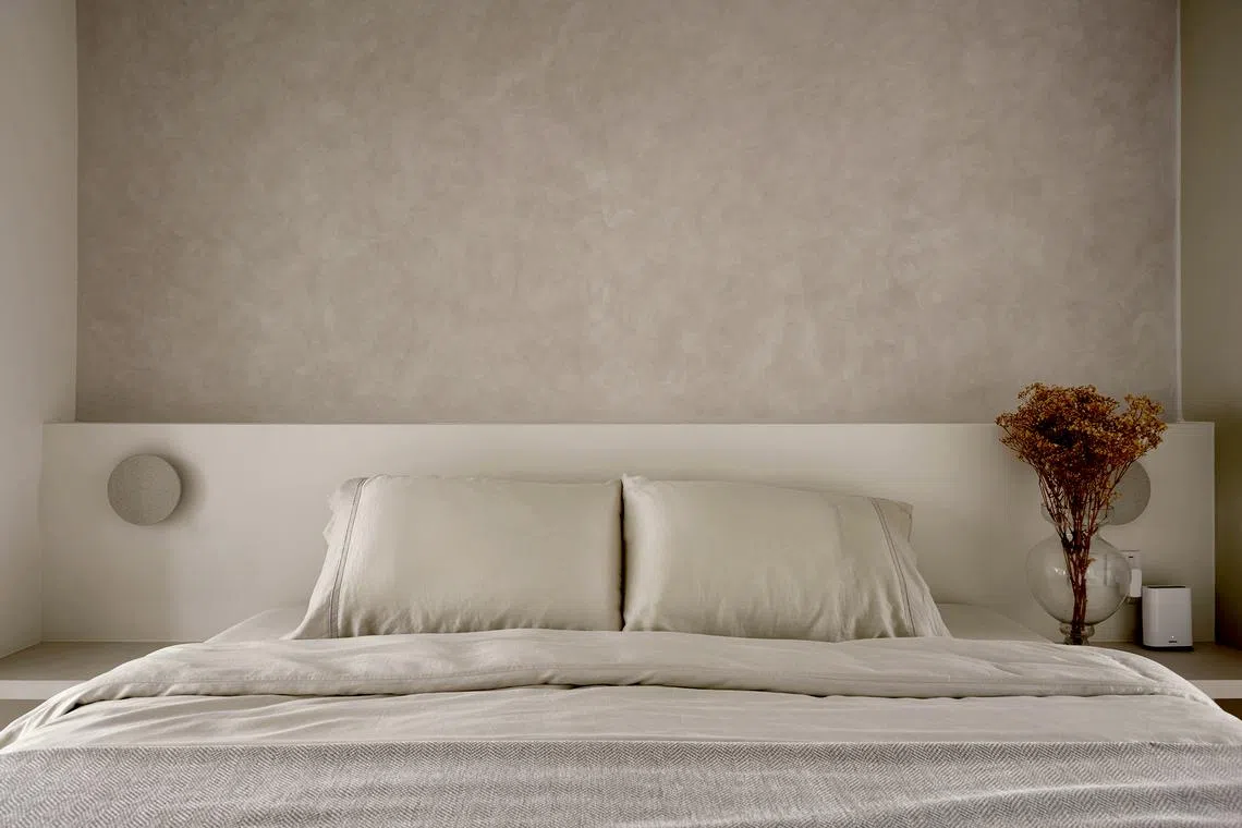 In the master bedroom, the design team created a customised bedframe to suit the interior theme. This is complemented by a limewashed wall behind the bed.