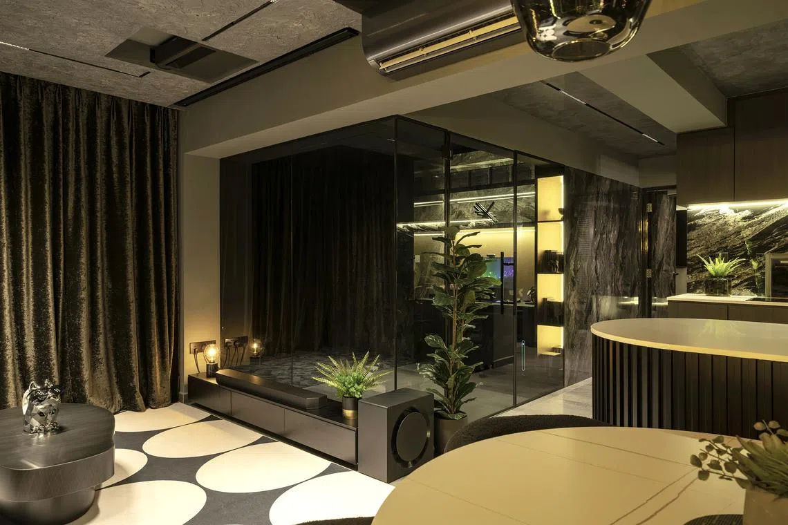 Meanwhile, the bedroom closest to the living area was converted into a study. Black-tinted glass walls were installed – not only to minimise distractions, but also to visually expand the living area by making the study look like an extension of the space.