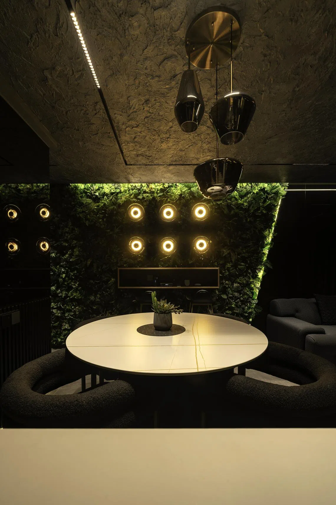 The faux rock ceiling and artificial plant wall add texture and visual interest to this HDB flat.