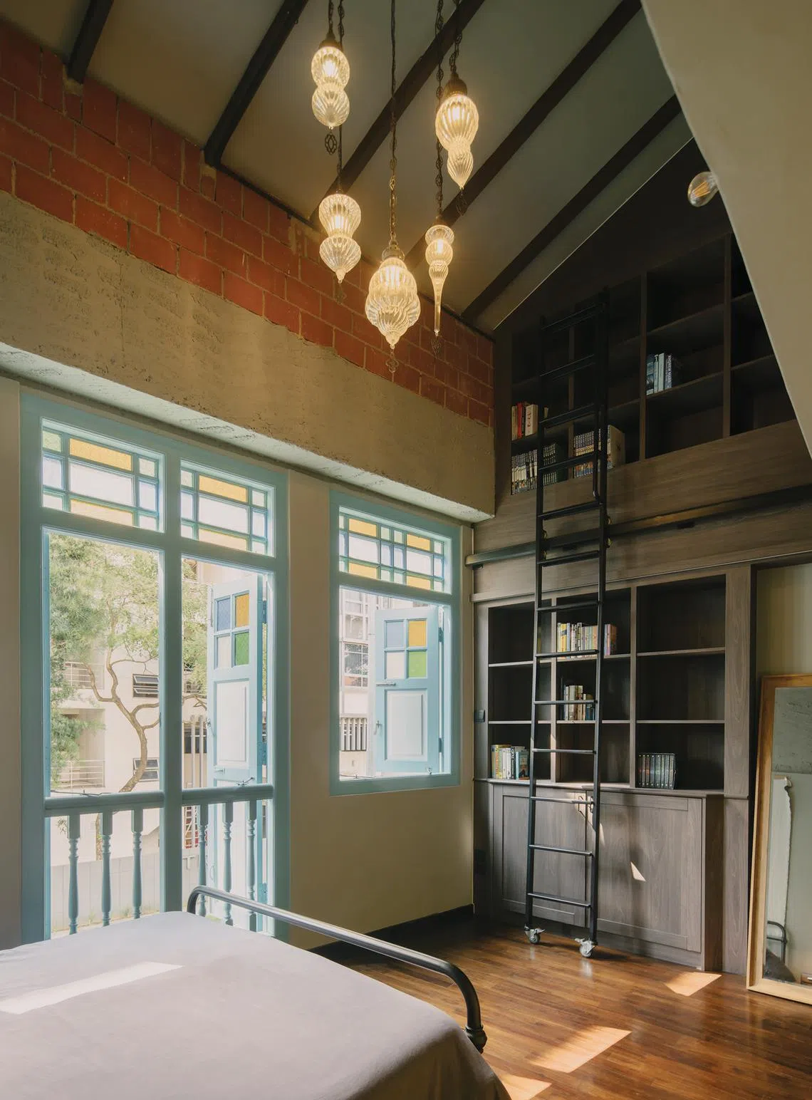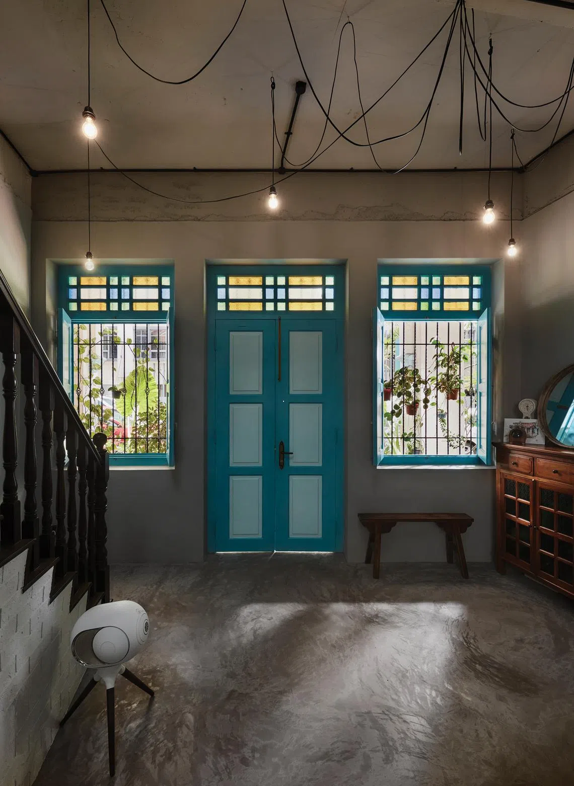 Two windows, each adorned with stained glass at the top, flank the shophouse’s front door.