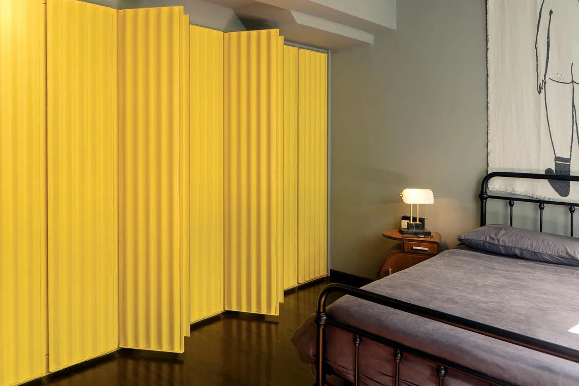 In the master bedroom, the design team built bookshelves all the way to the ceiling, with a rolling ladder for easy access. The bedroom’s wardrobe space is fronted by zinc sheets spray-painted a zesty yellow.