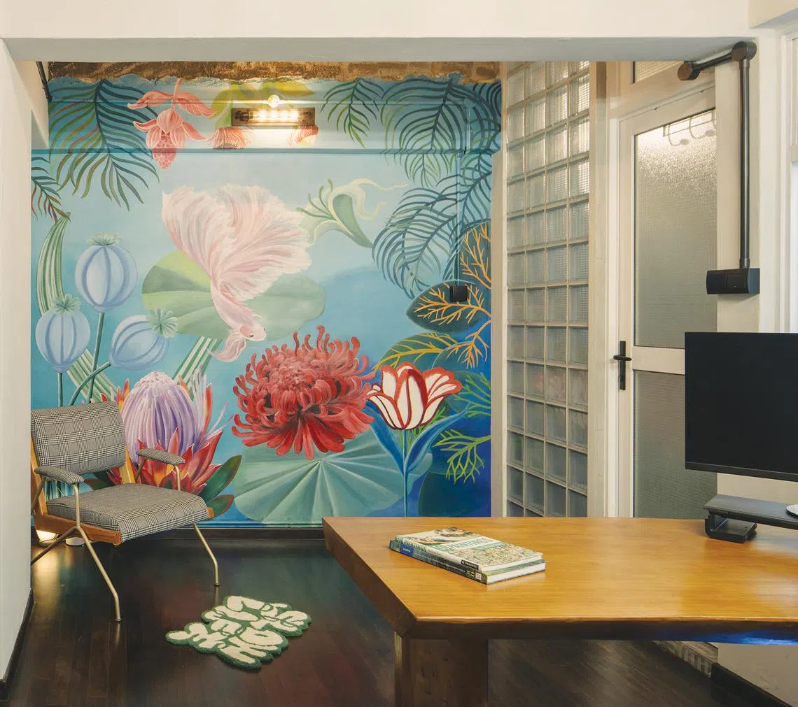 The study, brightened up by a colourful mural, shares a glass-block wall with the bathroom.