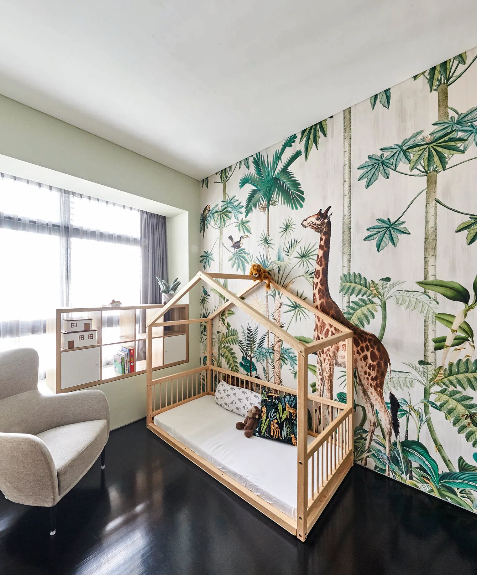 The biophilic touch continues in the son’s nursery, which features Hello Circus jungle-themed wallpaper and a custom baby crib from SimreKids, which is level with the floor so that the baby can explore his room safely.