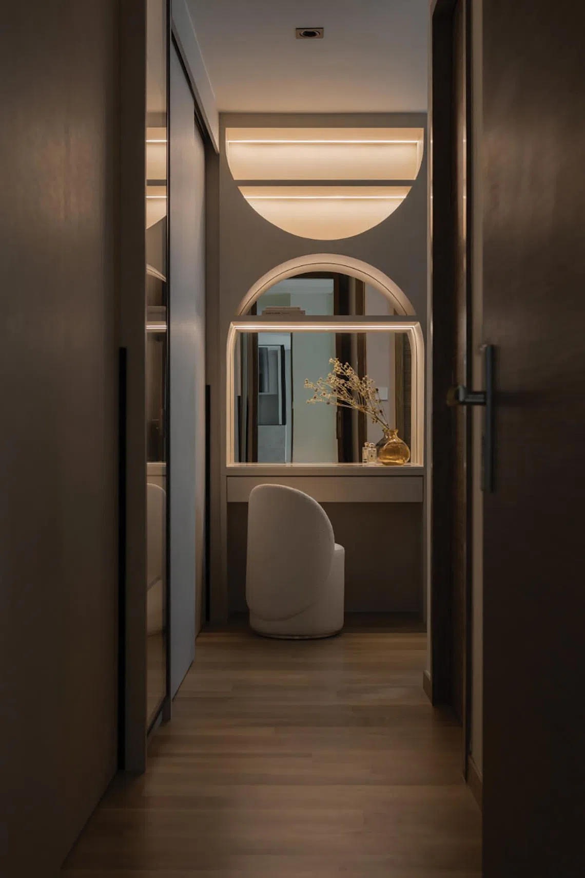 To the left of this area lies the master bedroom. The smaller unit’s existing kitchenette was replaced by a walk-in wardrobe, which leads to the sleeping area within the master bedroom. Inverted arches draw the eye past the doors of the walk-in wardrobe to the softly lit vanity area. The designers chose a neutral palette to create a calming ambience.