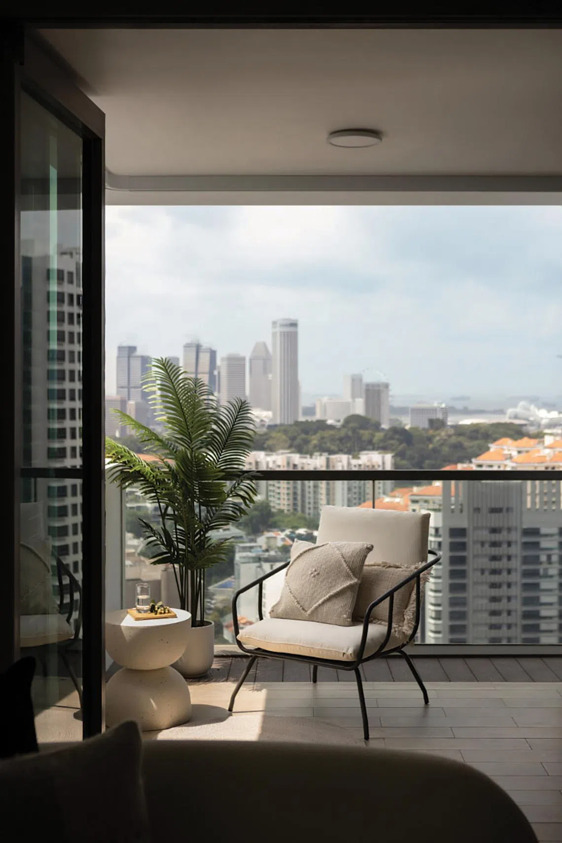 The living room extends to the balcony. Both spaces share a neutral palette.