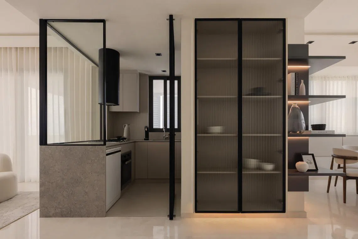 The designers introduced a pivot glass door so the kitchen could be properly closed off.