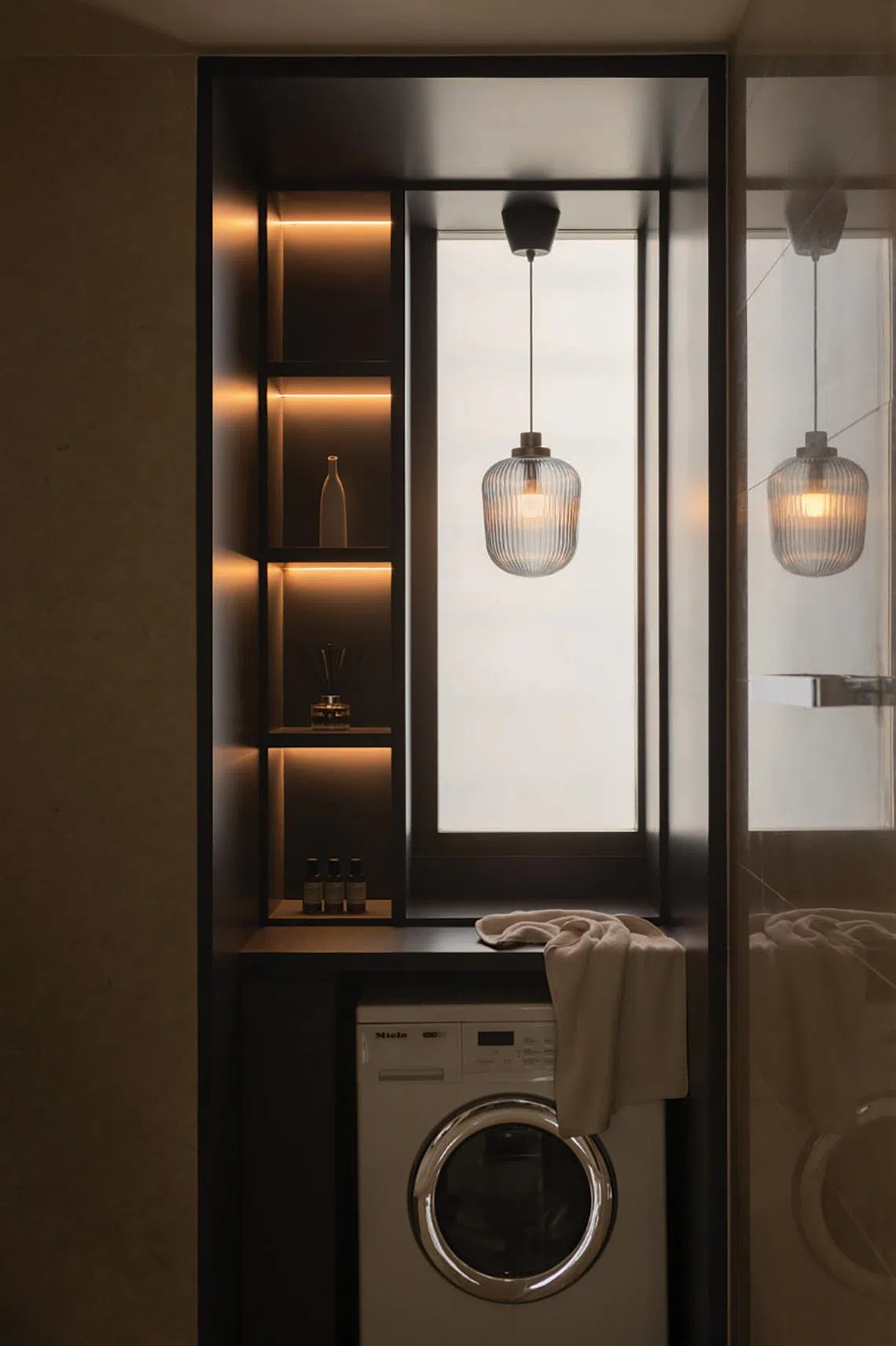 “We did not want to waste space creating door divisions, so working in design features such as wall-to-wall cabinetry and lighting made the laundry corner feel like part of the existing bathroom,” says Ms Wan.