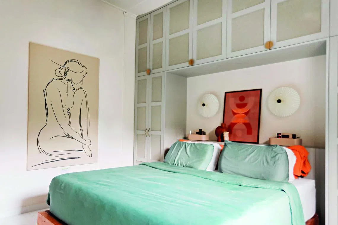 The priority for the new master bedroom was to create more storage. Instead of a standalone wall of wardrobes, the cabinets are designed to resemble a portal over the bed, with a ledge behind it that serves as the bedside table. Ms Fritschy used linen wardrobe doors for a lighter look that would also ensure the clothes inside were aired out.