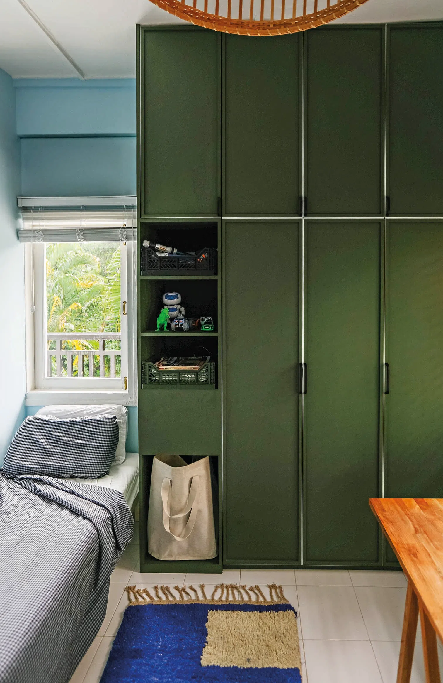 The family’s elder daughter loves green so Ms Barbara Fritschy created a green wall and ceiling feature that frames the bed.