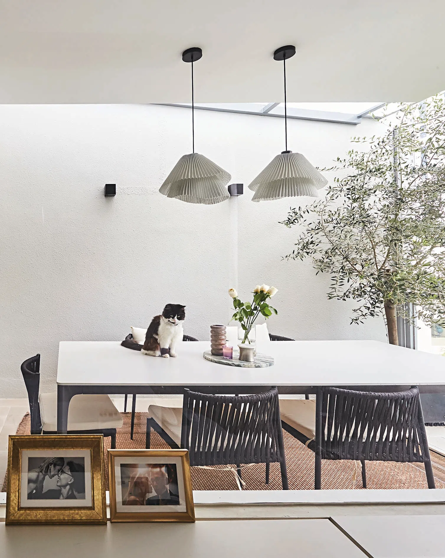 Hanging above the semi-outdoor dining table is a pair of Arturo Alvarez Tempo Vivace pendant lights from LAB2.1 by Sol Luminaire.