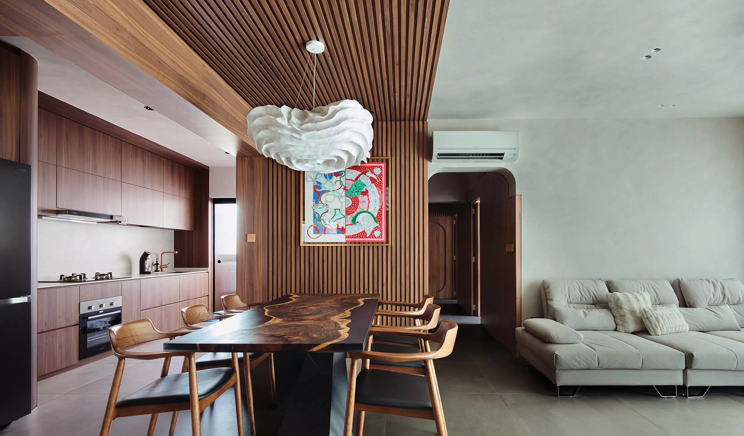 Looking into the flat from the outside, one notices a prevalent use of wood on the walls and ceiling. This creates a portal-like element that distinguishes the entrance foyer and dining area from the rest of the open-plan layout.