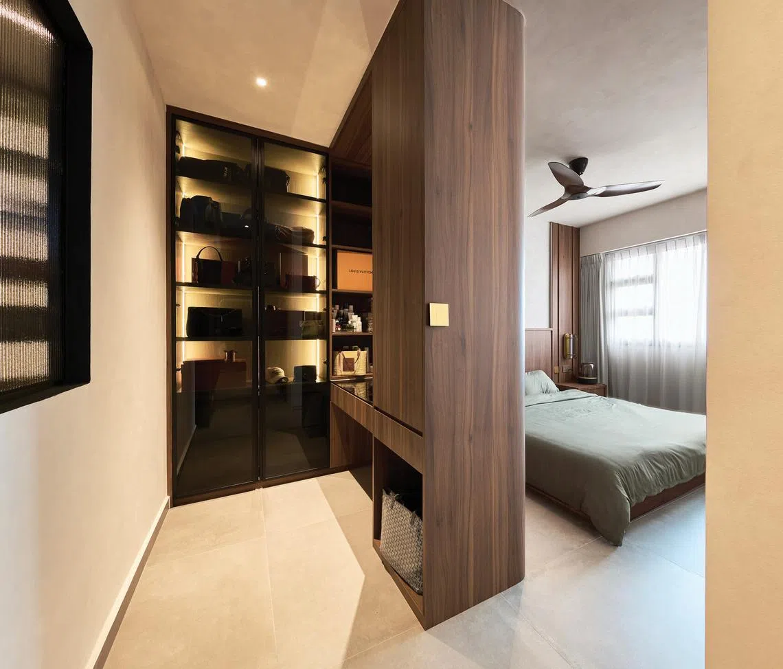 Having relinquished their walk-in wardrobe, the couple managed to carve out space within their master bedroom for a new walk-in wardrobe and dressing table, using the carpentry as a partition. By orienting this space away from the sleeping area, it allows Ms Tan to get ready for work without disturbing her husband.